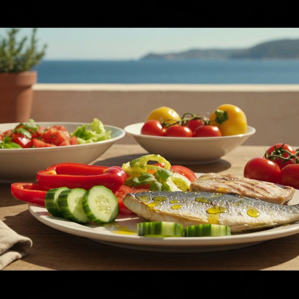 Vekt på grønnsaker, frukt, fisk, fullkorn og sunt fett som olivenolje.